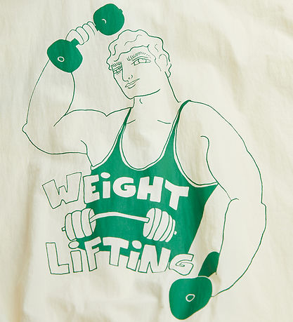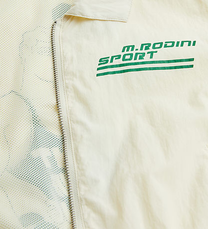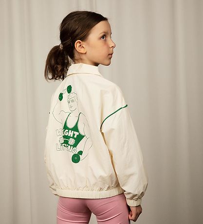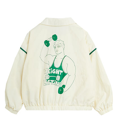 Smart Mini Rodini jacket in white with a green stripe on the shoulders and a print on the left chest of "W. Rodini Sport" in green. On the back is a large print of a weightlifter with the text "Weight Lifting" in green.