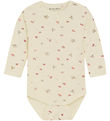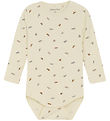 Lovely Minymo bodysuit in brown with ribbed structure. The Bodysuit has a round neckline with two buttons at the front. It has long sleeves with wide ribbed edges. The Bodysuit closes with push buttons between the legs and can be adjusted in length so that it can be used for a longer period of time.