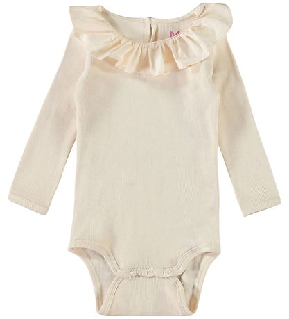 Nice Molo bodysuit with long sleeves in plain beige with a nice rib structure. All the way around the neck opening it has a nice ruffle of tightly woven cotton. The Molo bodysuit opens at the neck with a single button, and between the legs there are practical push buttons.
