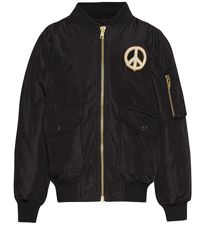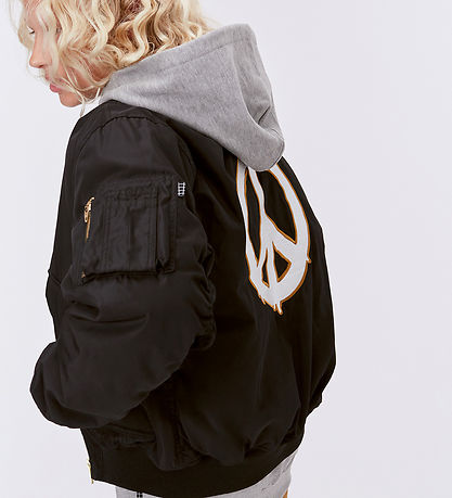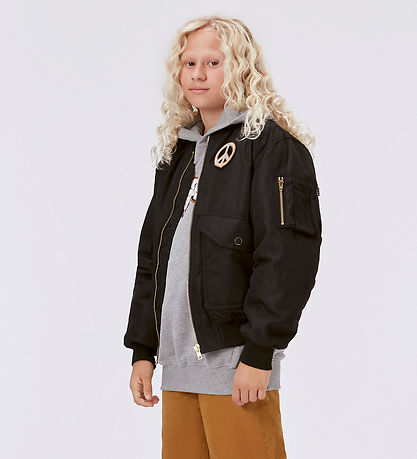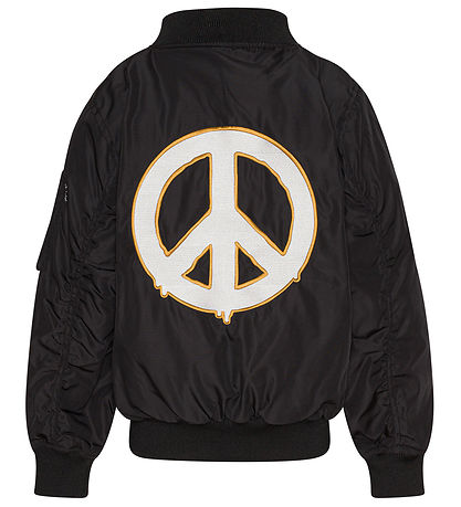 Cool Molo jacket in black in a smooth-woven quality. On the chest there is a round velcro application with a "peace" symbol, and on the back the same symbol is embroidered on a large scale.