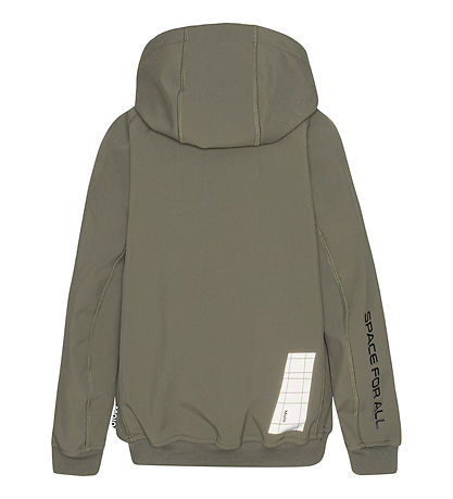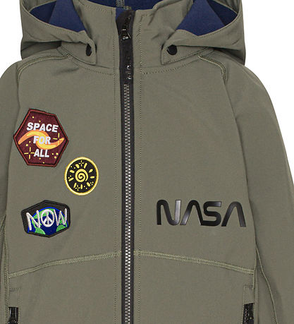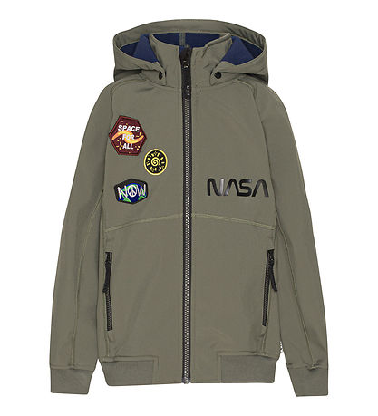 Cool Molo softshell jacket in dusty army green with cool NASA print and applications.