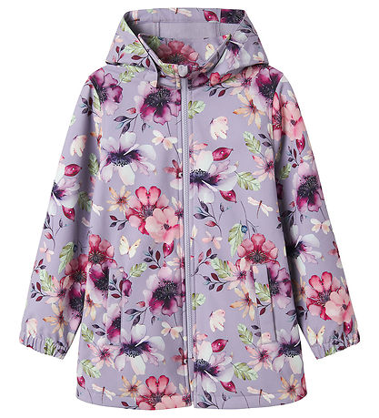 Cute Name It softshell jacket in purple with an allover print of flowers and butterflies in pink, purple and green shades.