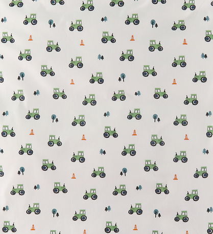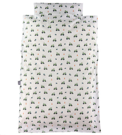 Fine Nørgaard Madsens bedding in white with a sweet allover print of small tractors in shades of green.