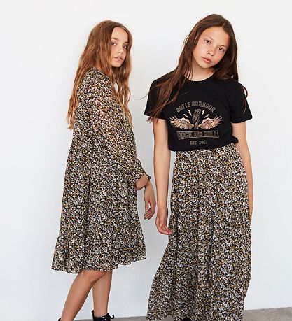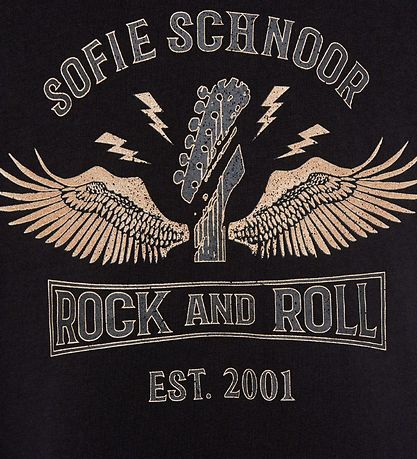 Smart Petit by Sofie Schnoor T-shirt in black with a print across the top of a guitar in grey and wings and lightning bolts in rose glitter. Around the print it says "Sofie Schnoor Rock And Roll Est. 2001".