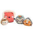 Smart Sebra activity ring ring, with the chameleon Carley at the top. Below, there is a teether ring shaped like a leaf and two zeros tags with crackle paper.