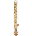 The Smallstuff pacifier clip has a round knob of light wood at one end with a clamp on the back, and on the other side there is a siliconering that can be put around a pacifier.