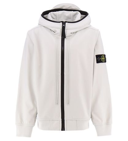 Beautiful Stone Island softshell jacket in plain light grey with a black zipper. At the top of the left sleeve, the iconic logo badge is fixed with buttons.