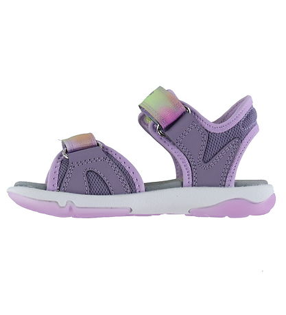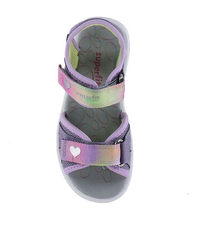 Lovely Superfit sandals in purple imitation leather and textile, with Velcro straps in yellow, green and pink shades with small hearts, and with light purple edges.