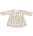 That's Mine tunic has a round throat with a narrow ribbed hem that opens with push buttons on the left shoulder. The Tunic has long sleeves. Around the waist, it has an elastic ruffle edge, which also creates fine folds in the skirt. The Tunic is in a delicious and stretchy cotton quality.