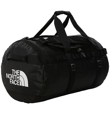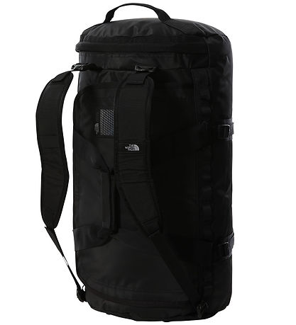 Cool The North Face travel bag in black with black straps and details, and at the ends it says "The North Face" in black letters. The travel bag is made of a strong, coated, waterproof material, and the bottom is black and made of a durable quality.