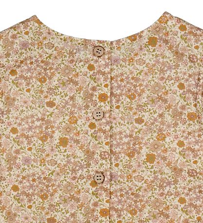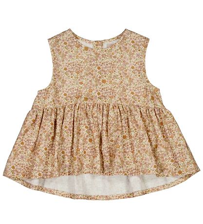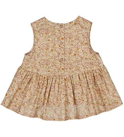 The Wheat top has wide shoulder straps and a round neckline. It has a seam around the chest, so it sheep nice folds and a good width. The top is opens at the neck with three buttons.