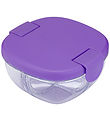 The Yumbox lunchbox has a square shape, and it has a fixed lid, which opens at the front with a clip. Inside, the lunchbox has a removable compartment divider with one large compartment, one oblong compartment, two smaller compartments and one small, round compartment for dipping or snacking. In the lid, there is soft silicone, which closes tightly around the room divider.