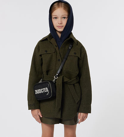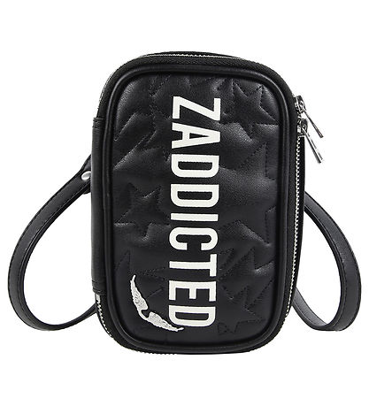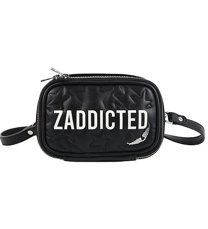 Smart Zadig & Voltaire bag in black, imitation leather, and on one side there are embroidered stars. On top is "Zaddicted" printed in white, and in one corner sits a silver metal tag shaped like a pair of wings.