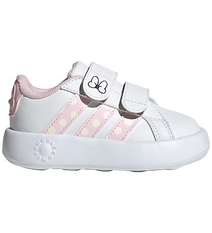 Beautiful adidas Performance shoes in white imitation leather and pink stripes with dots. On the heel and velcro strap there is a nice Minnie Mouse bow that gives a cute look.