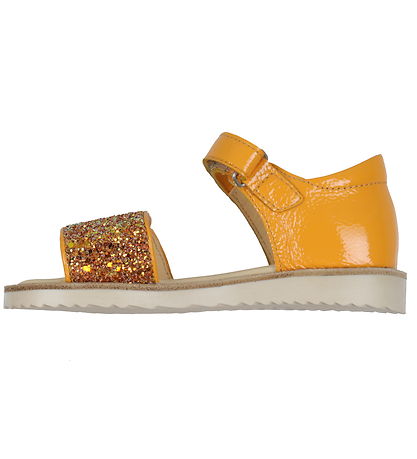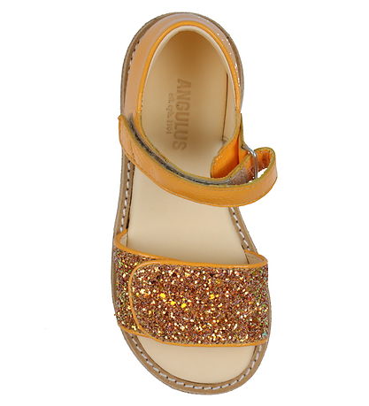 Adorable Angulus sandals in shiny orange with multicolour glitter on the back of the foot.