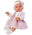 Asi baby doll Alex wears a nice dress in white with an all-over floral print in shades of pink and green, and with a nice frill at the neck with a nice pointelle. The Dress opens with velcro on the back. Alex has a nice headband in pink tulle with a nice bow on top. The Doll has a pair of fine bloomers in the same colour and print as the dress.