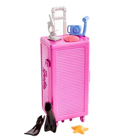 The Barbie doll set provides many hours of fun and play. The fair-haired Barbie is wearing a green swim vest and underneath there is a swimsuit which cannot be removed. In the pink cardboard suitcase, all her cases can be, to become the leading marine biologist. stickers of fish and plants are also included, with which it can be decorated.