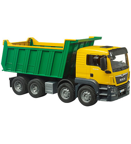 Cool Bruder truck, which is a realistic model of a MAN TGA truck with tipper. The truck is in a green yellow color theme and appears completely like the real thing in the 1:16 scale.