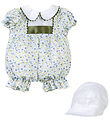 Cute Cam Cam Copenhagen doll clothes consisting of a kiss, a dress and a pair of bloomers. The kiss and the dress are in white with a beautiful allover print of berry plants in red and blue. The bloomers are in plain red.