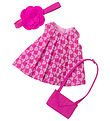 Cute Cam Cam Copenhagen doll clothes consisting of a kiss, a dress and a pair of bloomers. The kiss and the dress are in light rose with pink bows and hearts. The bloomers are in plain pink.