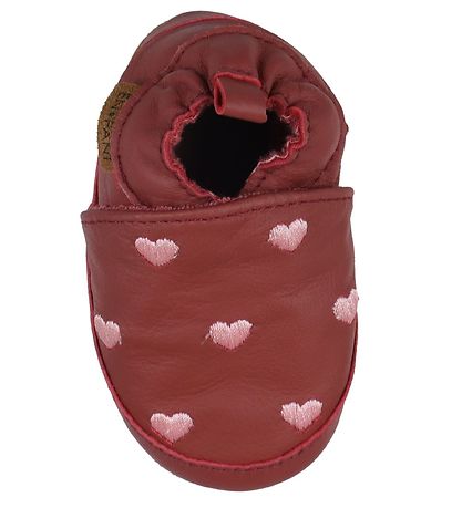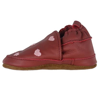 Beautiful En Fant soft soles in dark red leather with pink embroidered hearts on the ankle.