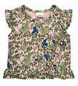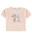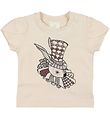 Beautiful En Fant t-shirt in white with horizontal stripes in beige and blue shades. At the chest there is a little fake pocket with button detail. The T-shirt has a round neckline with ribbed edges and short sleeves.