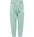Beautiful Hummel sweatpants in blue green with a print on the left thigh of a white Hummel bee. At the back there is a white print on the right pant leg of the characteristic shevrons all the way down.