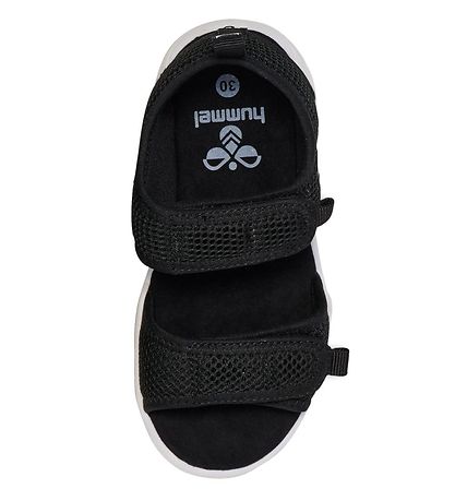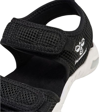 Smart Hummel sandals in black textile, with the brand's name and logo printed in white on the outside. On the heel are the well-known shevrons and the sandals have lights that flash on the outside when the kid walks.