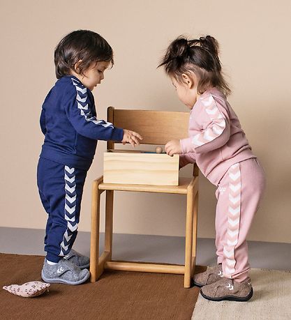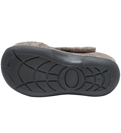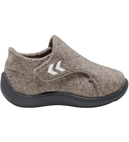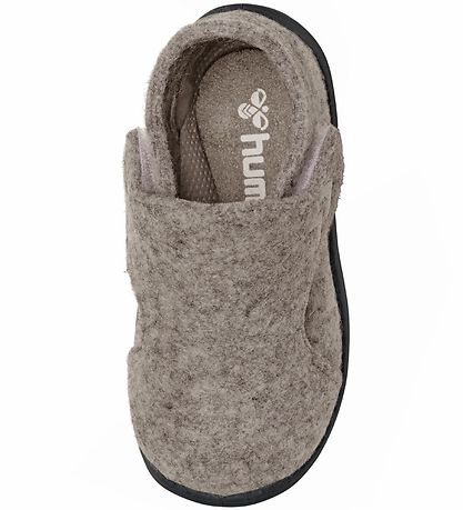 Cute Hummel slippers in beige wool with charcoal gray outsole. Both on the inside and outside of the slippers, the familiar angles are embroidered in white, and then there is Hummel on the heel.