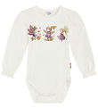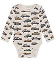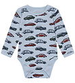 Beautiful Hust and Claire bodysuit in light blue with a print of cars in blue, green and red shades. The Bodysuit has a round neckline with push buttons at the left shoulder and long sleeves. It closes between the legs with push buttons. The Bodysuit is made of soft merino wool.