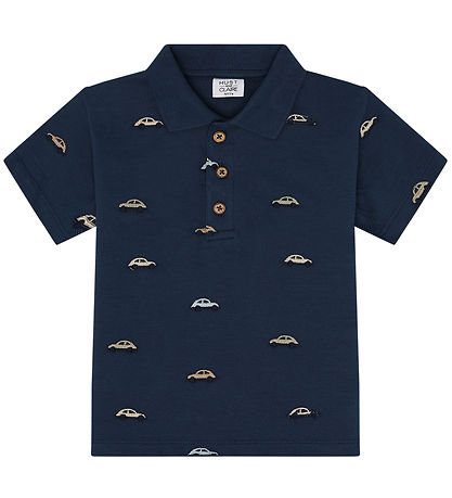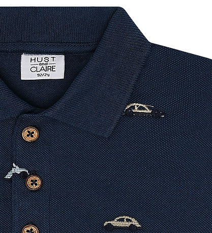 Classic Hust and Claire polo in dark blue piqué, adorned with small embroidered cars in different colours all over.