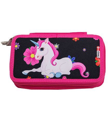 Nice Jeva pencil case in black with pink edges and a print on the front of a unicorn in pink surrounded by fine flowers.