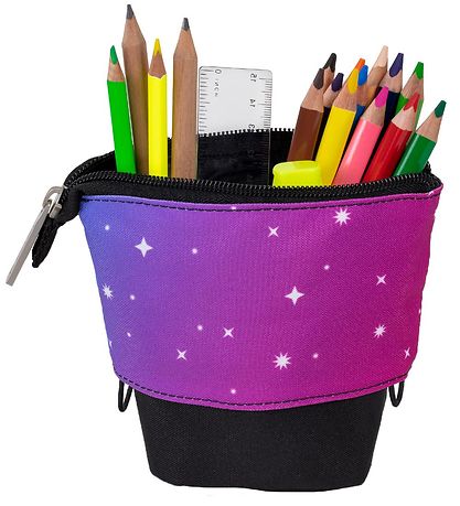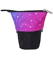 Cool Jeva pencil case in black with a print of a rose and purple starry sky.