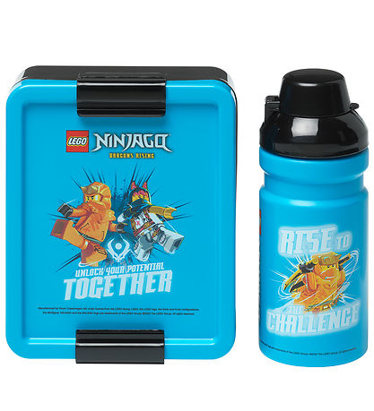Fun LEGO® Storage lunchbox set in blue and black with cool prints of LEGO® Ninjago. In the middle of the lunchbox and at the bottom of the water bottle there is a LEGO® logo.