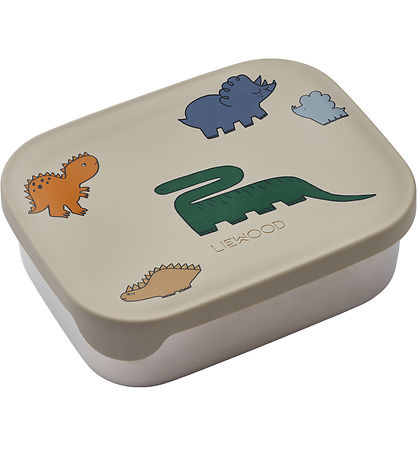 Smart Liewood lunchbox in a smart steel color with a lid in light grey with a print of dinos in different colours.