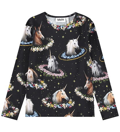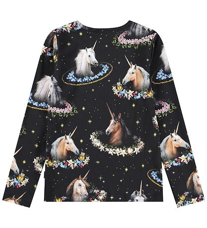 Fairytale blouse from Molo with a unique allover print of unicorns surrounded by flowers in different colours on a black background.