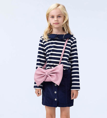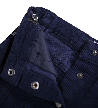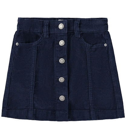Elegant Molo corduroy skirt in navy blue with buttons all the way through the front. The velvet skirt is a card model with elastic at the waist, which can be adjusted with buttons inside. It has practical belt loops and two pockets at the front.