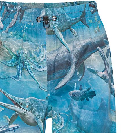 Cool Molo rain pants in sea with an allover print of sharp-toothed, prehistoric sea creatures. The Rain pants are also equipped with a large, reflective Molo star on the back of the right leg.