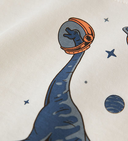 Beautiful Name It blouse in white with a print on the front of dinosaurs in space in blue and orange shades. The Blouse has a round neckline with a narrow ribbed edge and long sleeves.