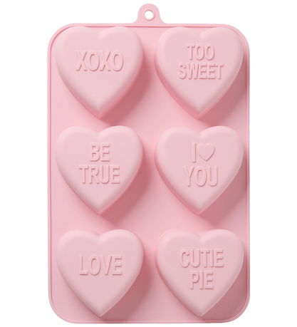 Beautiful Rice cake mold in pink silicone and with holes shaped like hearts with different words at the bottom.