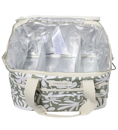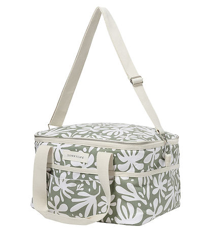 Fine SunnyLife cooler bag in olive green and cream white with allover flower print.
