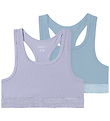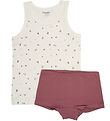 Fine Wheat underwear, consisting of a undershirt and a pair of knickers in dusty purple with a pretty floral print. The Undershirt has narrow shoulder straps and the set has both fine lace and wavy edges.