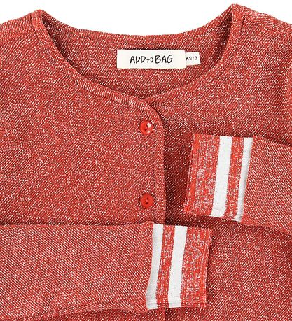 Delicious Add to Bag cardigan in burnt red with nice silver glitter. There are two wide, white stripes around the edges of the arm and waist openings.