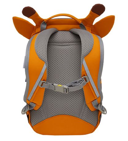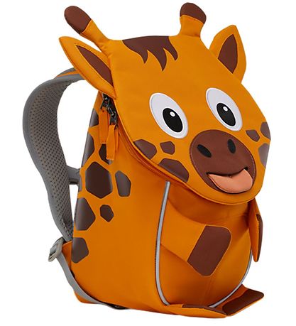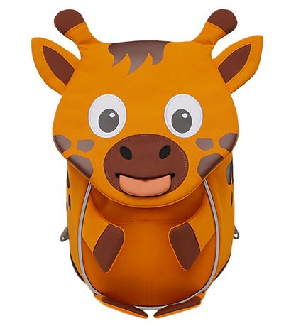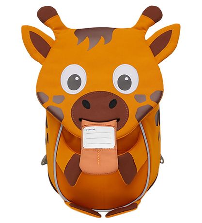 Cute Affenzahn backpack in orange and brown shades with the shape of a giraffe. In front there are two ears, arms and a mouth that sticks out a tongue. The tongue is attached with an elastic band, and when you pull it, a name tag comes into view.
