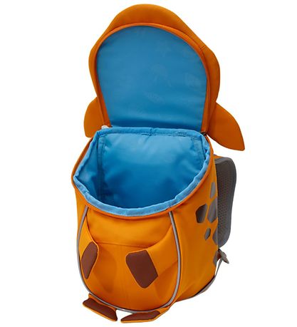 The Affenzahn backpack consists of a large compartment which opens around the underside of the head with a double zipper. The Bag is light blue on the inside.