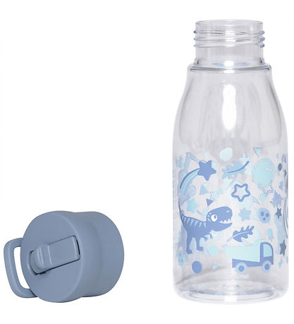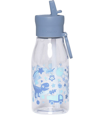 Nice Beckmann water bottle in ready plastic and with a blue lid with spout lid. On the page there is a print of both dinos, working machines and things from space.