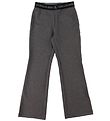 Smart Clavin Klein trousers in beige with a large logo in grey on the left leg and decorative stitching.