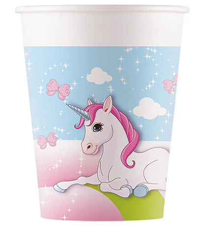 Fine Decorata Party paper cups in white with a unicorn theme print in beautiful colours. The paper cups are sold as an 8-Pack and each has a capacity of 200 mL.
