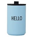 The Design Letters thermo cup has a lid, and at the top you can open up to a little drinking hole with a knob that has to be turned. The thermo cup closes completely tightly, and it can contain liquid up to 90 degrees.