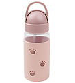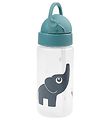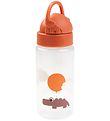 The Done By Deer water bottle has a lid with a handle. When you push the handle back, a straws appears and when the lid is closed, the liquid can not flow out. The straw is made of soft silicone.